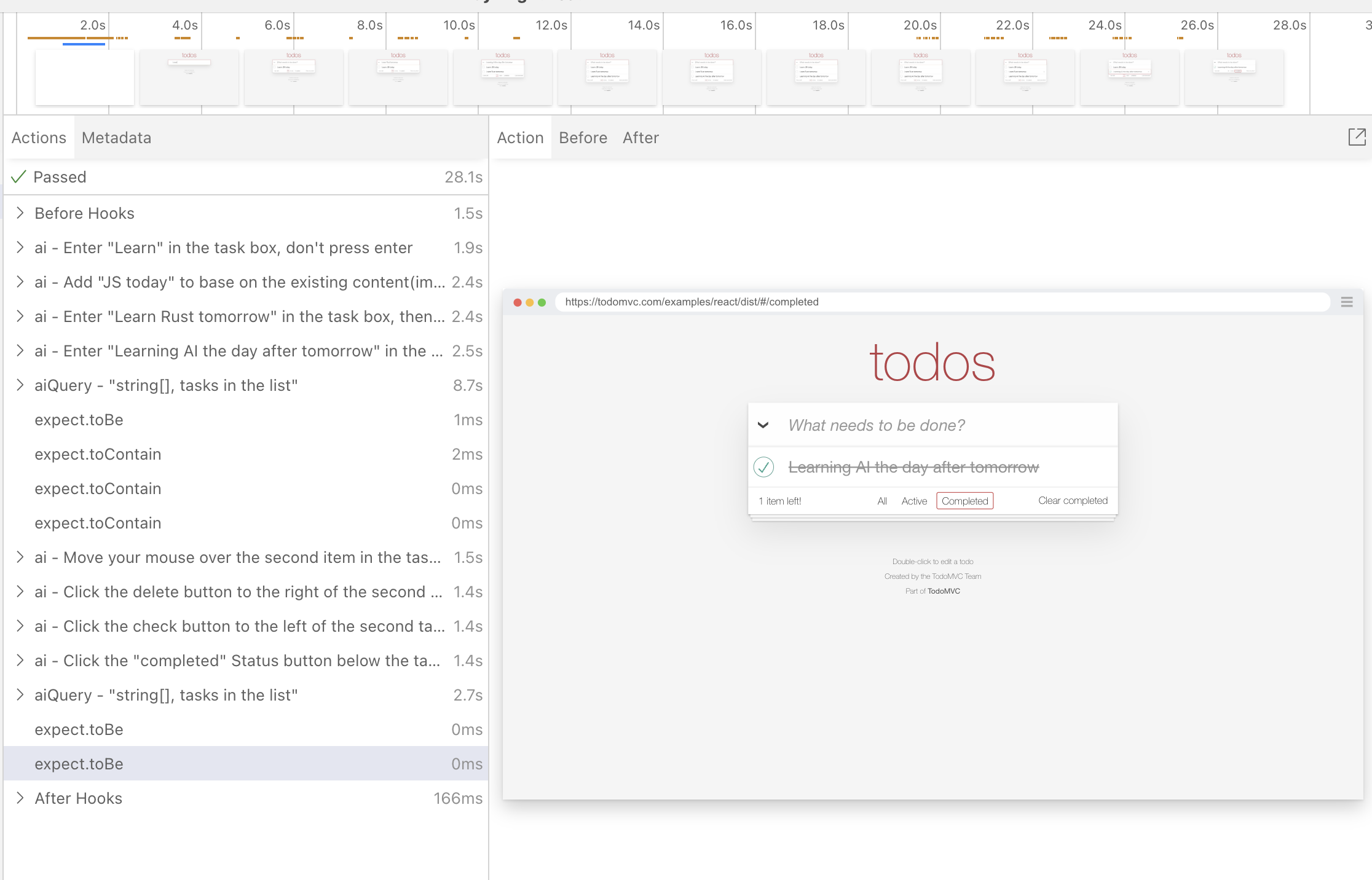 Playwright AI task report shows the overall time and aggregates AI tasks by test group